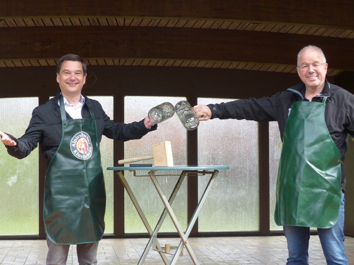 Es ist ungewohnt still – der Platz vor dem Musikpavillon im Calmbacher Flößerpark ist leer. Kein Zelt, keine Biertische, keine feiernden Mai-Wanderer und Blasmusikfreunde. Trotzdem wollten es sich Bürgermeister Klaus Mack und Uwe Göbel, ehemaliger Vorsitzender der Orchestervereinigung Calmbach (OVC), nicht nehmen lassen, den Fassanstich für die Mai-Hocketse – unter den gegebenen Umständen eben virtuell - wie gewohnt durchzuführen. Bereits seit 1995 gibt es diese Veranstaltung zum Auftakt des Wonnemonats Mai im Calmbacher Flößerpark und "seit nahezu 20 Jahren besuche ich – wann immer es möglich ist – dieses Fest", so Klaus Mack mit ein wenig Wehmut in der Stimme. "Wenn wir schon nicht im OVC-Biergarten feiern können, dann bieten wir wenigstens über unsere Homepage und Facebook einen Eindruck sowie eine schöne Erinnerung an die vergangenen Mai-Feste", so die beiden Verantwortlichen. "Und ein wenig Humor während der Krise macht diese leichter", so Mack bei den mit Abstand durchgeführten Aufnahmen für den kleinen Film, der seit dem 1. Mai auf Facebook zu sehen ist. Zu den Klängen der Polka "Ehrenwert", eingespielt von der Orchestervereinigung Calmbach in ihrem "Musik im Home-Office-Projekt", hoben Klaus Mack und Uwe Göbel mit zwei Armlängen Abstand ihre leider leeren Gläser und stießen auf einen schönen Maianfang und in diesem Jahr vor allem auf die Gesundheit der Bürger an.
